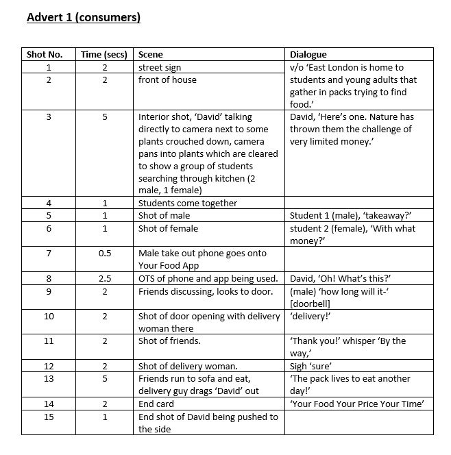 Personally, I'm really happy with how my adverts have turned out as I feel like they successfully convey the fun and friendly brand image that I tried to create for YourFood as well as the quick delivery that they provide. I hope that are memorable adverts through the comedy and mockumentary film style and are therefore convincing enough to attract the TA to YourFood.